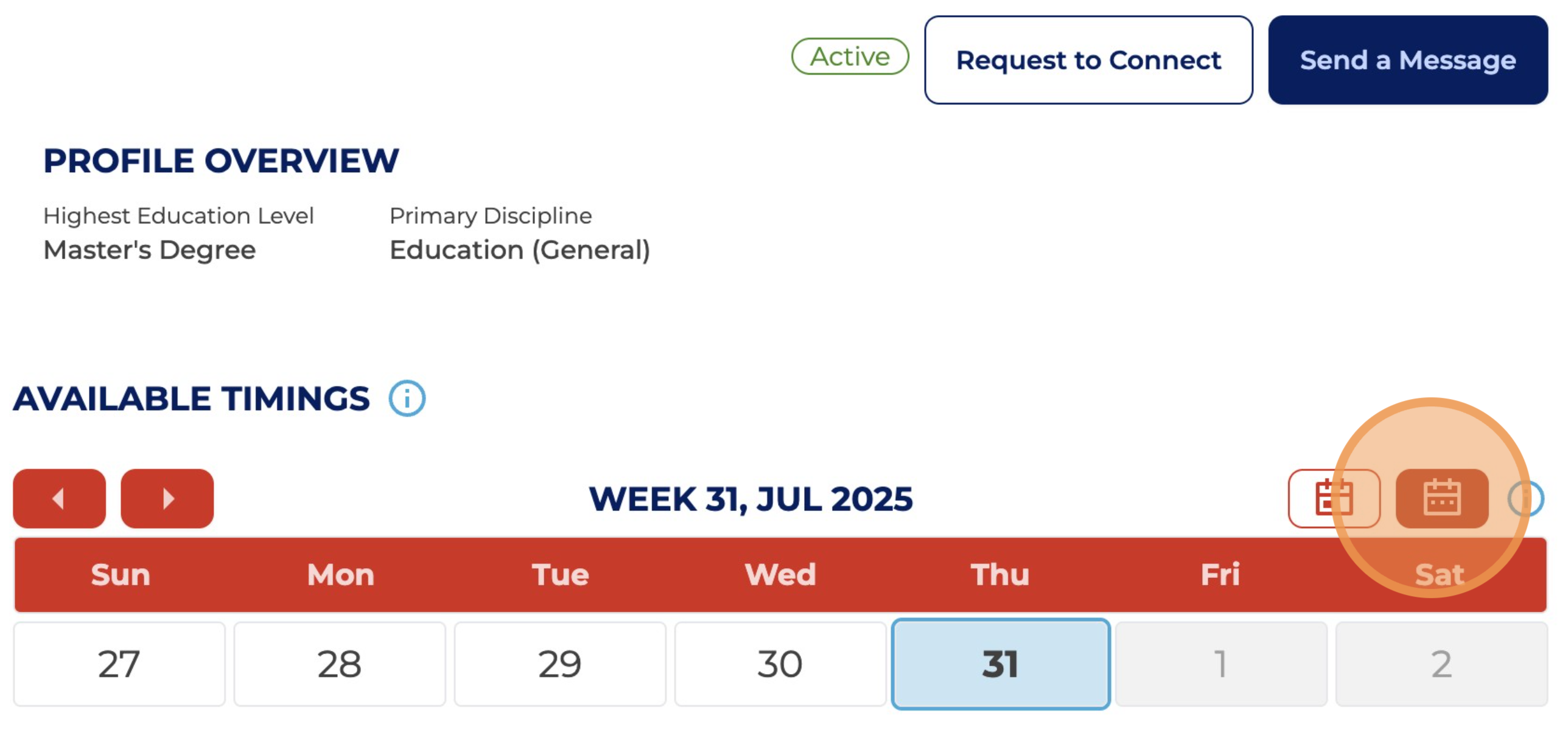Scroll to the bottom of the profile page to view the mentor or coach’s available schedule. Toggle between weekly and monthly view by clicking on the red calendar icons.